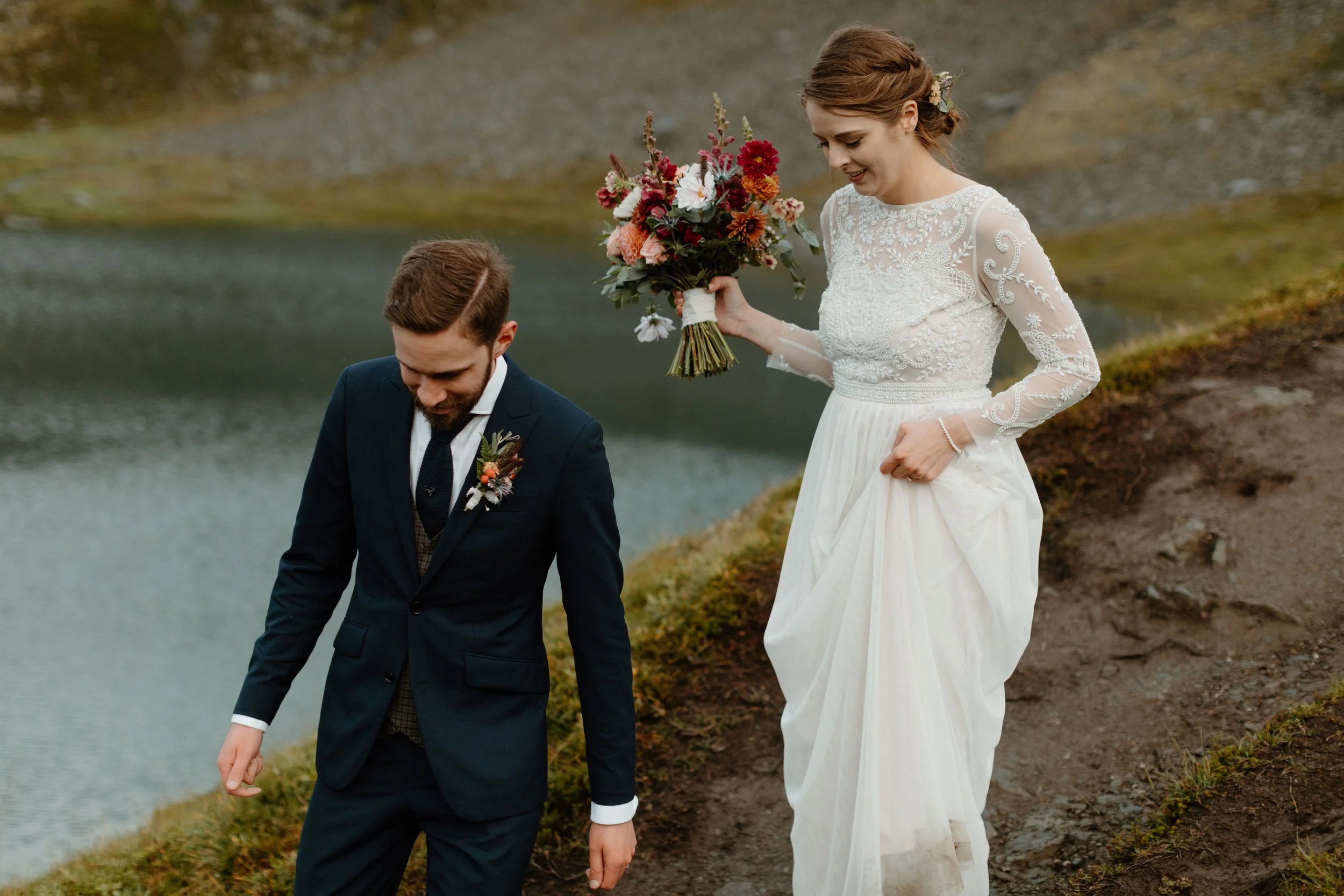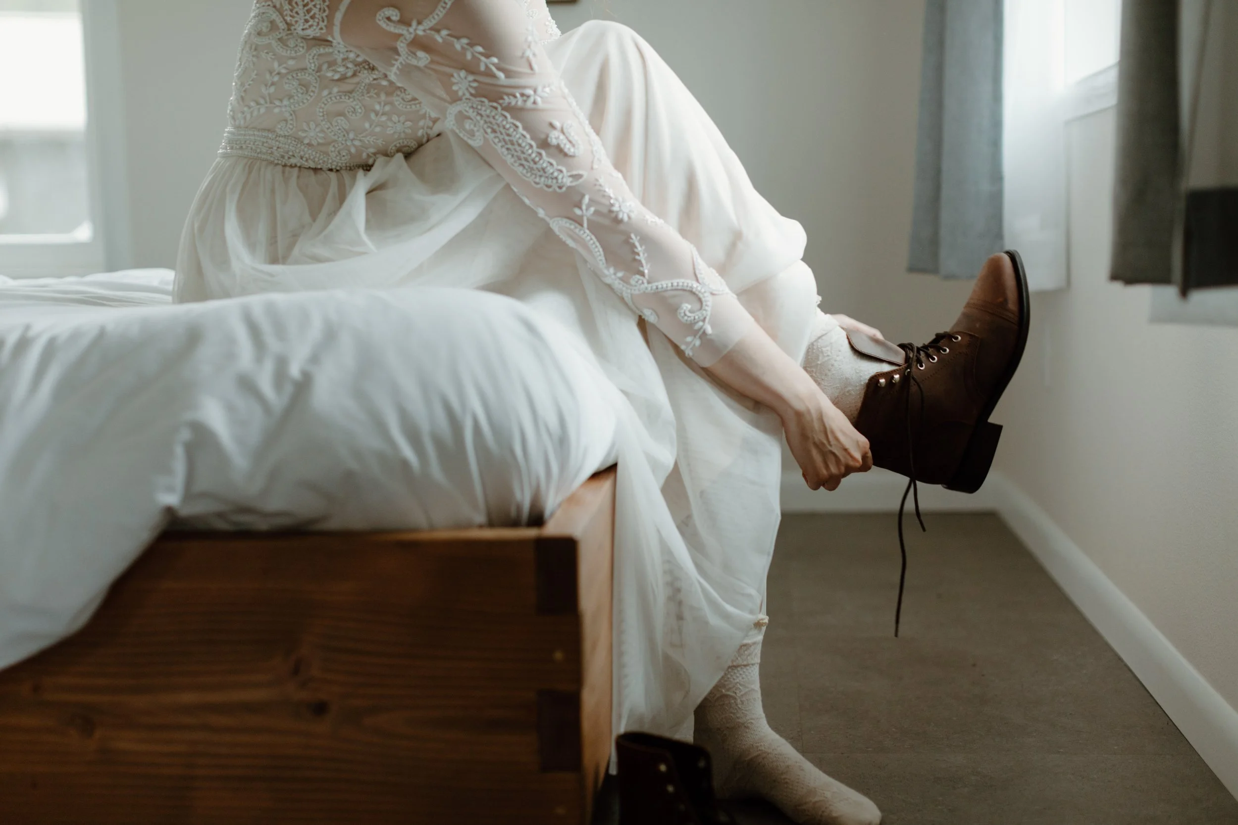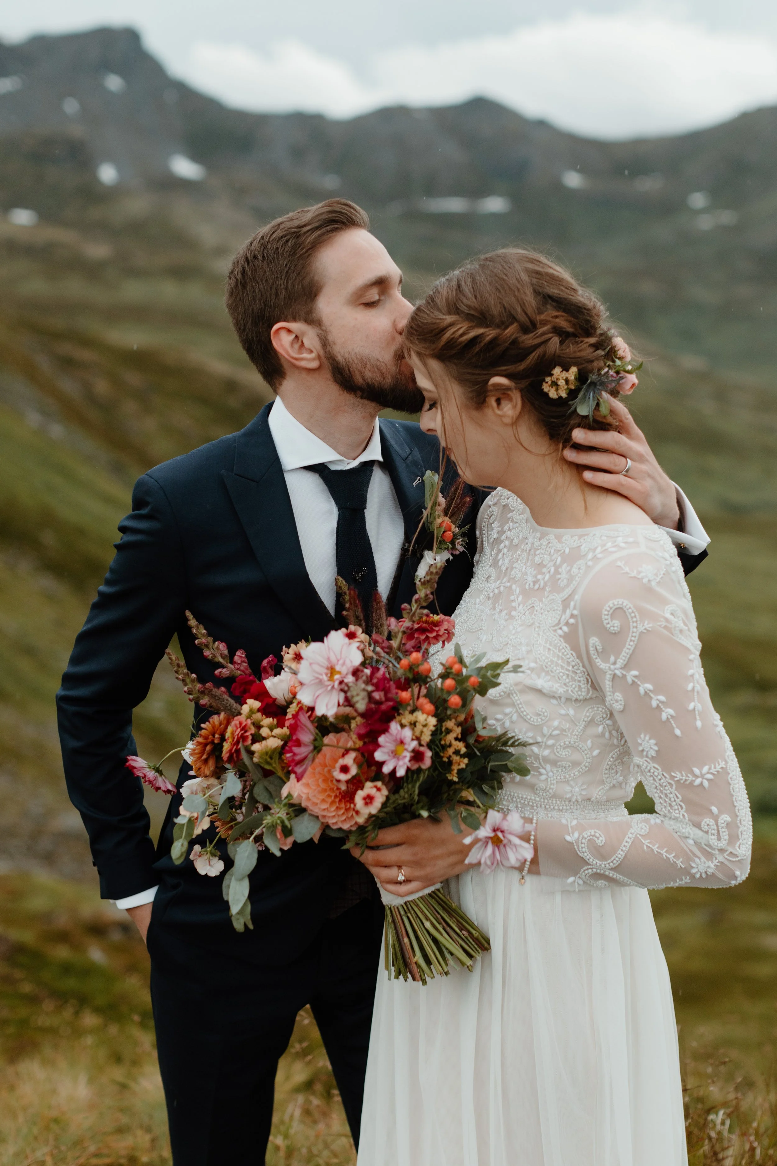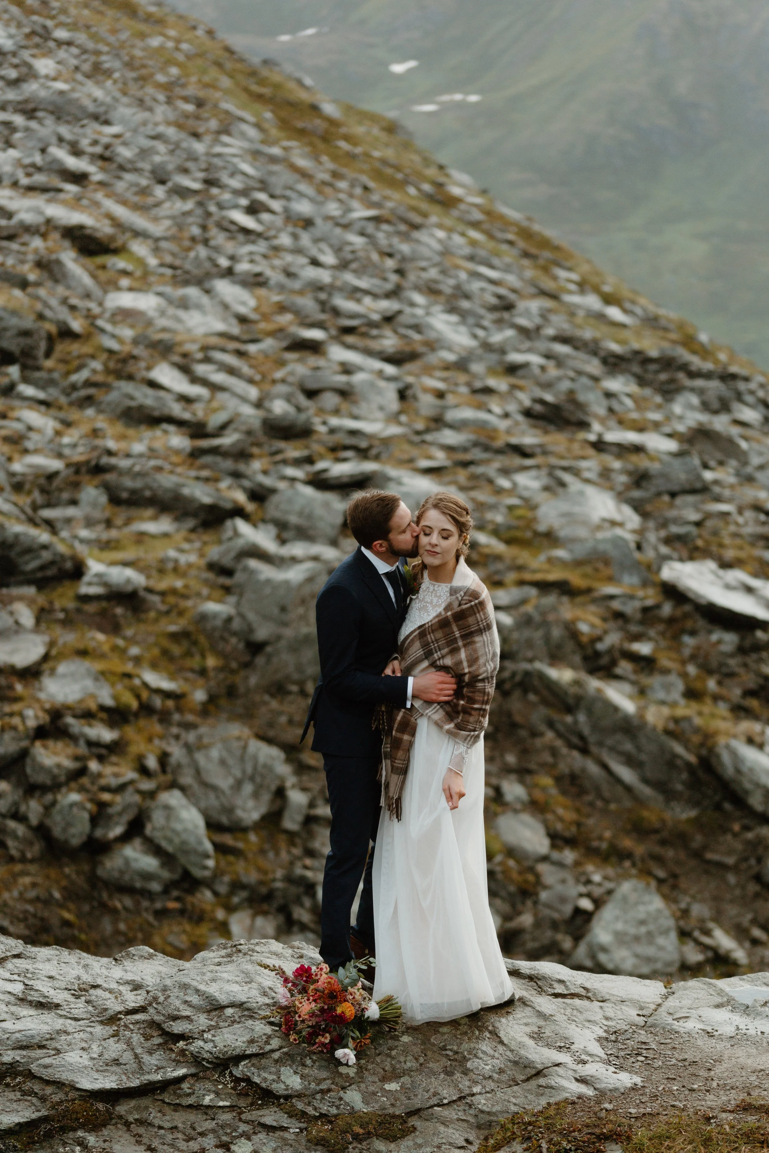 Their day began at a cozy cabin nestled just down the road from Hatcher Pass at Meier Lake Resort. Cassie and Jaffery wanted to honor the tradition of getting ready separately before their first look, so Jaffery got ready first in their cabin, then Cassie. Each included pieces into their attire with meaningful nods to Scotland. Jaffery wore a special tartan plaid vest and stag tie pin, while Cassie brought a tartan plaid shawl that wore during parts of the day. These thoughtful touches tied their Alaskan elopement to the Scottish heritage they had originally planned to celebrate! They also wore hiking boots to add to the adventure and honestly, practicality for hiking through the mountains. Cassie wore the infamous Sinclair gown by BHLDN (Anthropology Weddings) and her custom bridal bouquet from Paper Peony was beyond colorful and classic. Years later, it’s still one of my favorite bouquets!