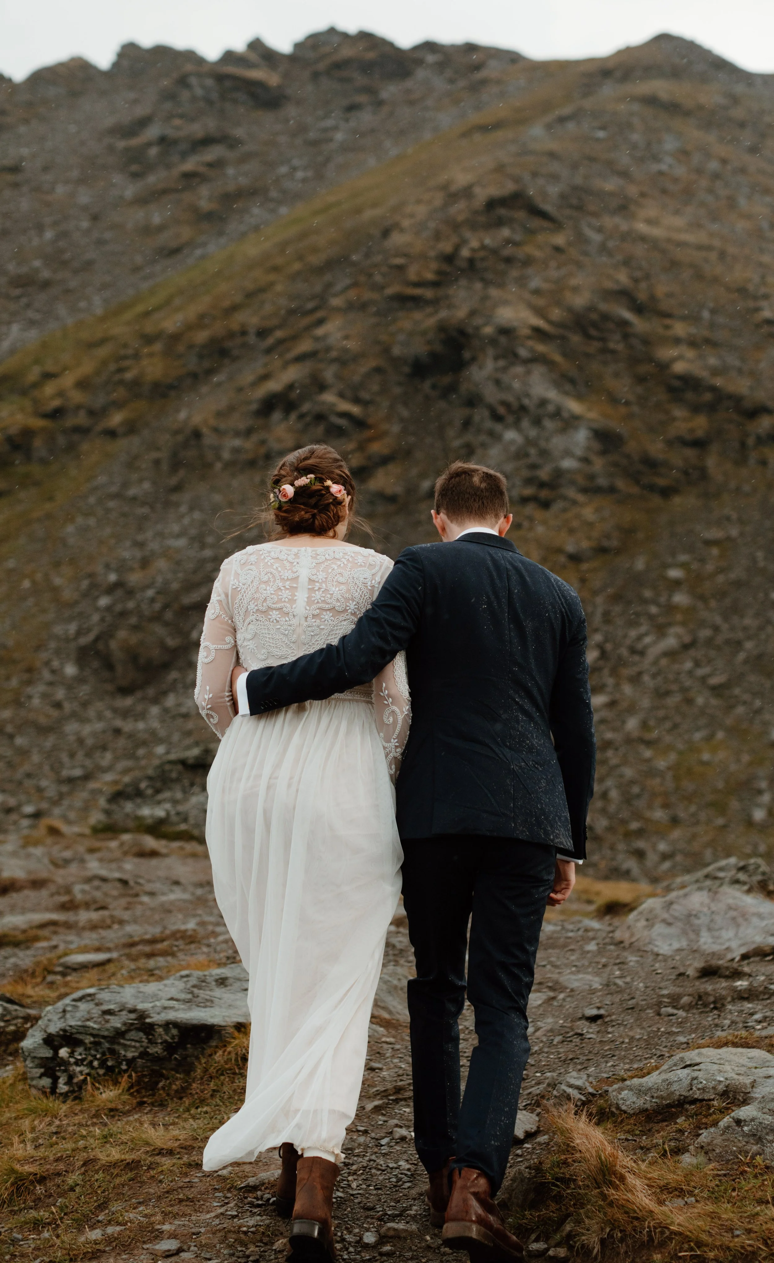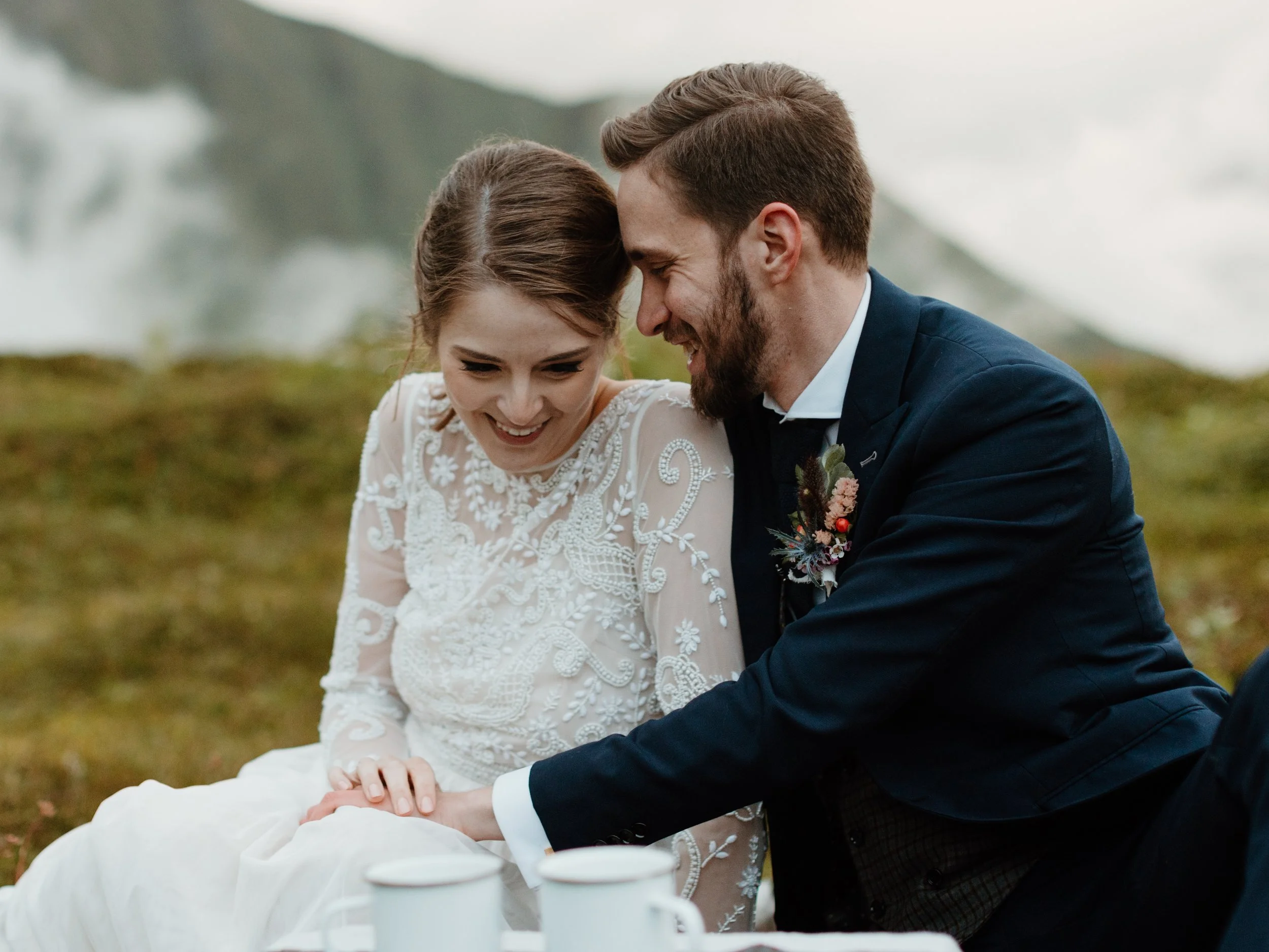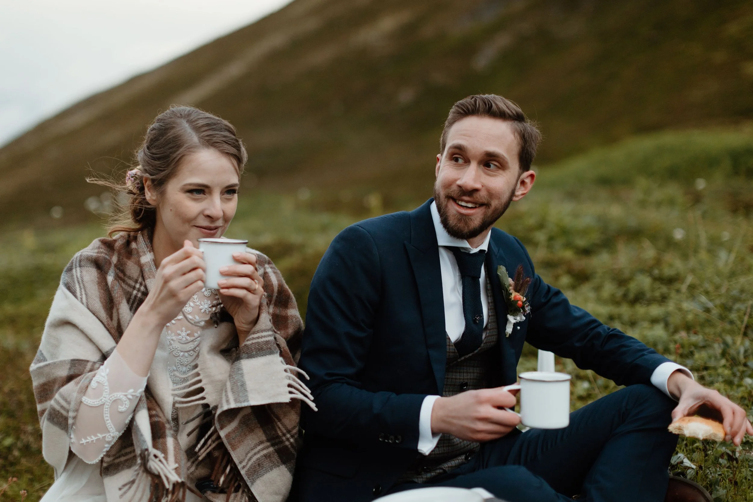 The couple had their ceremony on one of the high points, overlooking the valley and dirt haul road below. It was officiated by Celtic Ministries (quite fitting for their Scottish elopement) and was deeply personal and steeped in tradition. Along with exchanging personal vows and rings, they incorporated sharing a Quaich, or "love cup." This tradition involves the couple drinking from the same vessel, often filled with whisky or a mix of two drinks, symbolizing unity and trust. These meaningful rituals, paired with the stunning surroundings, made their ceremony an unforgettable celebration of their love. The talented Megan Rai was part of the adventure capturing everything on video for the couple as well!