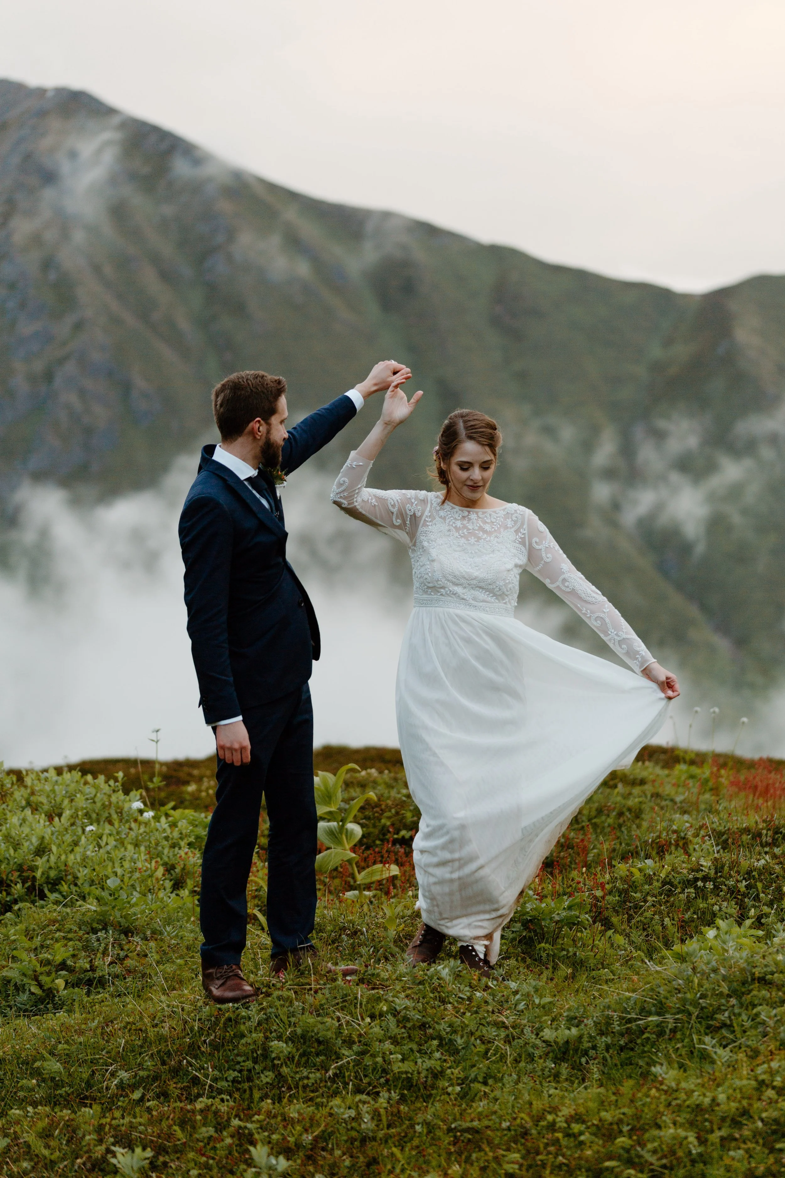 As their elopement day to an end, Cassie and Jaffery embraced the mystery of the mountains literally running through the wildflowers laughing and dancing together. It was so cute! Having your first dance in the mountains, above the clouds is such an epic memory! Capturing these moments of pure happiness was an absolute honor. Even though they couldn’t physically be in Scotland, what we created in Hatcher Pass gave them an elopement day just as meaningful and magical as their original dream!
