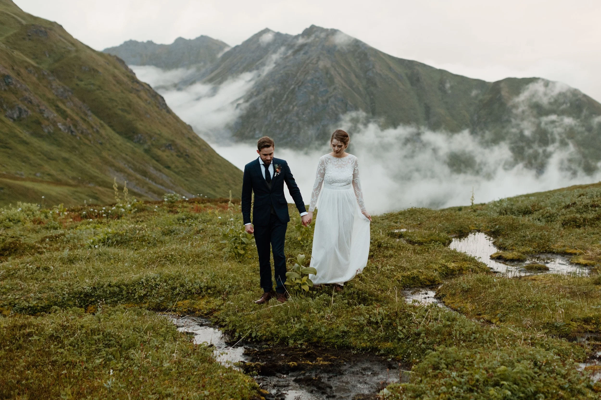 Cassie and Jaffery had long dreamed of a romantic elopement in Scotland, imagining lush green hills, misty skies, and ancient traditions surrounding them on their special day. Unfortunately, international travel restrictions during the pandemic made that impossible, but they pivoted their plans and chose Alaska as the next best thing! When they reached out to me, I was thrilled to help them plan an experience that brought their moody vision to life. Hatcher Pass came to mind as a great alternative since it’s incredibly similar to Scotland's lush landscape and layered mountains. Here’s a little more about their story and some photo highlights from their Highland-inspired elopement!